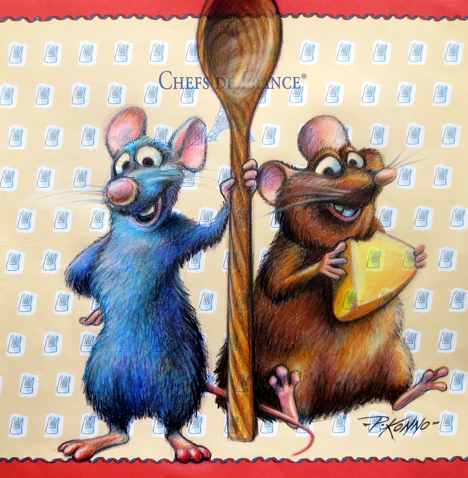 Remy & Emile – color pencils on a placemat of the Chefs de France restaurant / Epcot.
