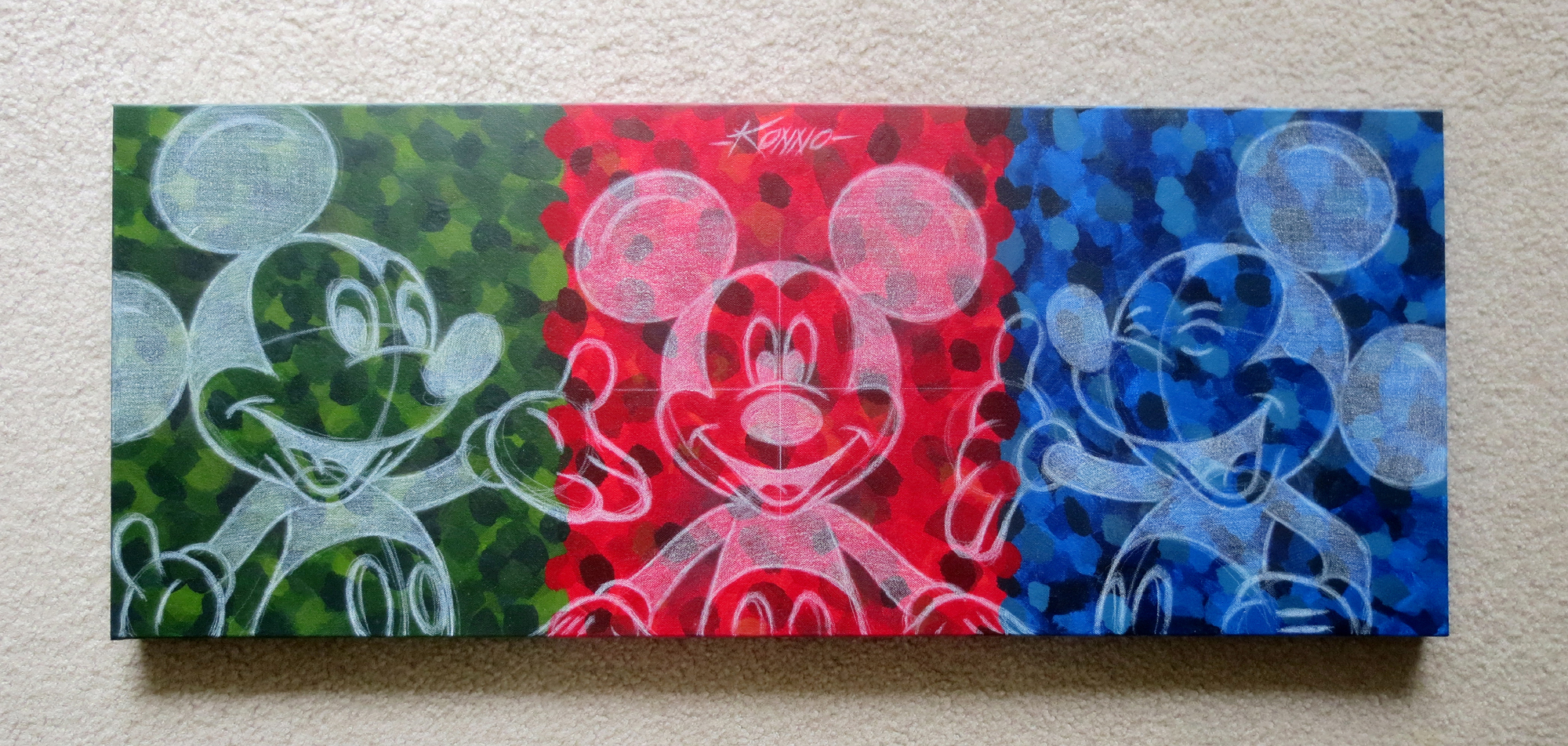 The Colors of Mickey – acrylics and white pencil on 16x40 inch canvas.
